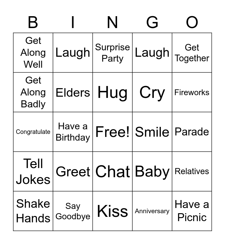 This bingo card has a free space and 24 words: Greet, Say Goodbye, Hug, Shake Hands, Get Together, Get Along Well, Get Along Badly, Laugh, Smile, Chat, Cry, Congratulate, Baby, Relatives, Elders, Anniversary, Parade, Surprise Party, Fireworks, Have a Birthday, Have a Picnic, Tell Jokes, Laugh and Kiss.