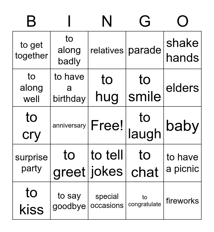 This bingo card has a free space and 24 words: to greet, to say goodbye, to hug, to kiss, shake hands, to get together, to along well, to along badly, to laugh, to tell jokes, to smile, to cry, to chat, to have a picnic, to have a birthday, to congratulate, baby, relatives, elders, anniversary, fireworks, surprise party, parade and special occasions.