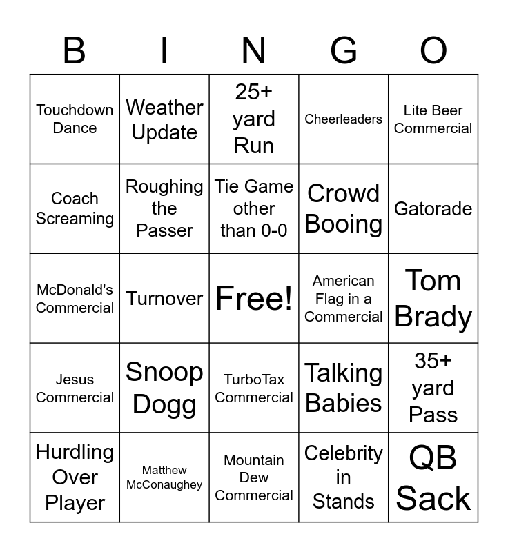 This bingo card has a free space and 25 words: Snoop Dogg, Mountain Dew Commercial, Tie Game other than 0-0, Hurdling Over Player, Lite Beer Commercial, Touchdown Dance, Coach Screaming, Weather Update, American Flag in a Commercial, TurboTax Commercial, Crowd Booing, McDonald's Commercial, Talking Babies, 35+ yard Pass, Roughing the Passer, Fan on Cellphone, Tom Brady, 25+ yard Run, Gatorade, Turnover, QB Sack, Matthew McConaughey, Jesus Commercial, Cheerleaders and Celebrity in Stands.