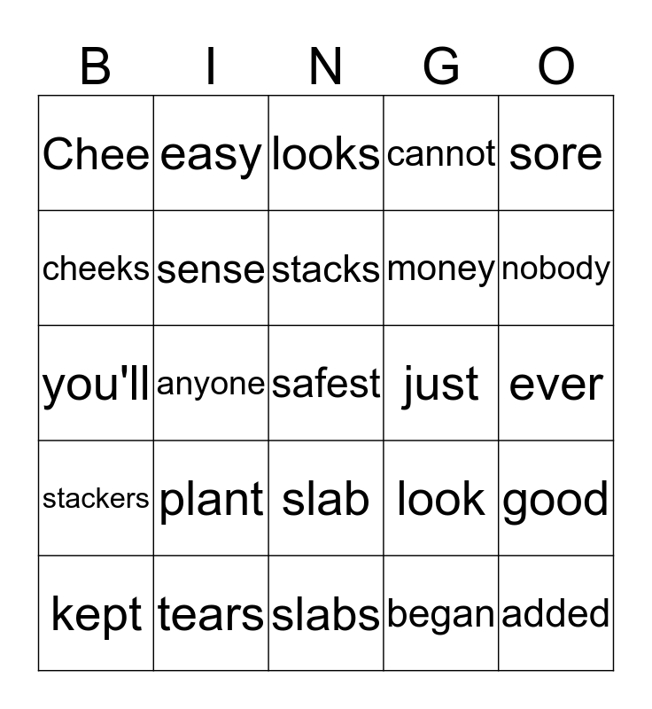 This bingo card has a free space and 24 words: plant, tears, stacks, kept, sore, Chee, cheeks, easy, just, slab, money, you'll, look, good, sense, began, ever, looks, nobody, anyone, added, stackers, cannot and slabs.