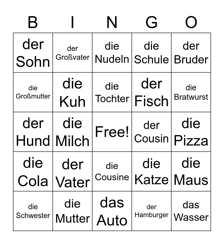 This bingo card has a free space and 24 words: der Vater, die Mutter, die Tochter, die Schwester, der Bruder, der Sohn, die Großmutter, der Großvater, der Cousin, die Cousine, der Fisch, der Hund, die Katze, die Maus, die Kuh, der Hamburger, die Pizza, die Nudeln, die Bratwurst, die Milch, das Wasser, die Cola, die Schule and das Auto.