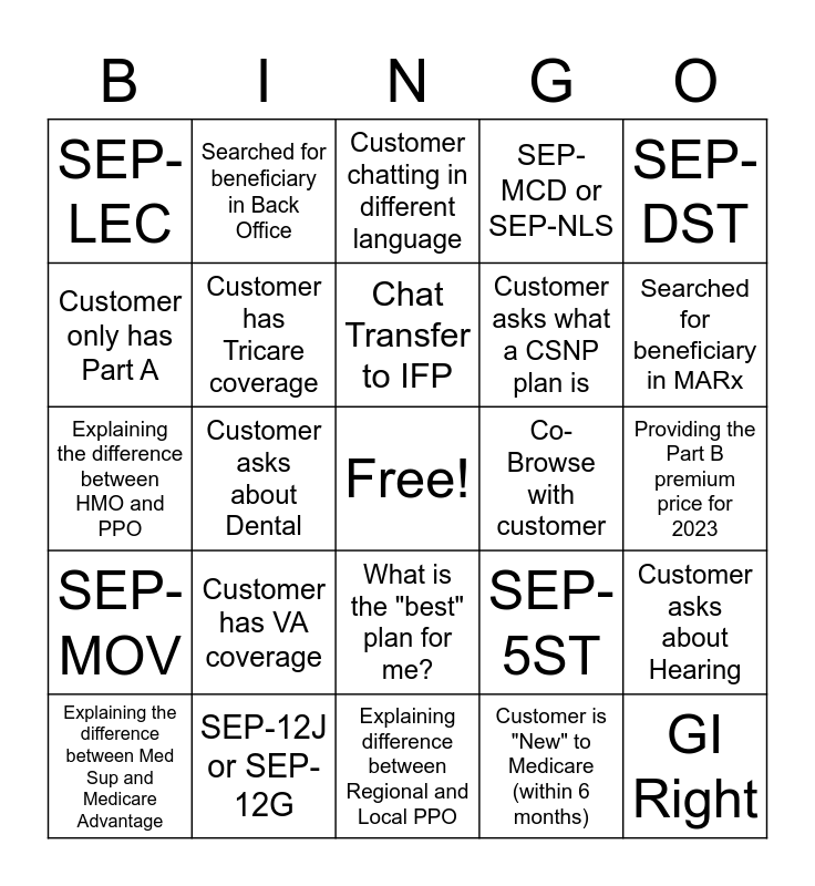 This bingo card has a free space and 34 words: Customer uses explicit language, Customer is "New" to Medicare (within 6 months), Customer has Extra Help, Customer requests a phone call, SEP-MOV, Customer has Tricare coverage, SEP-DST, Explaining the difference between Med Sup and Medicare Advantage, Searched for beneficiary in Back Office, Chatter is POA, Chat Transfer to IFP, Customer chatting in different language, Customer needs help with Customer Center, Post chat survey is "Very Satisfied" with 10/10 with a positive comment, Co-Browse with customer, Searched for beneficiary in MARx, SEP-12J or SEP-12G, Explaining the difference between HMO and PPO, Customer has VA coverage, SEP-5ST, What is the "best" plan for me?, Customer asks you to explain specific drug costs, SEP-LEC, Providing the Part B premium price for 2023, Explaining difference between Regional and Local PPO, GI Right, SEP-MCD or SEP-NLS, Customer asks what a DNSP plan is, Customer asks what a CSNP plan is, Customer only has Part A, Customer only has Part B, Customer asks about Dental, Customer asks about Hearing and Customer asks about Vision.