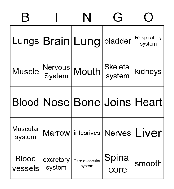 This bingo card has a free space and 24 words: Marrow, excretory system, Mouth, Blood vessels, Respiratory system, Lungs, Muscle, Brain, Joins, intesrives, Skeletal system, Blood, Nerves, Liver, Nervous System, Spinal core, Heart, Lung, kidneys, Nose, smooth, Muscular system, bladder and Cardiovascular system.