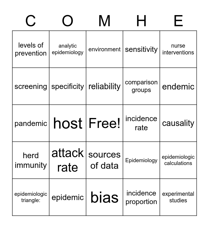 This bingo card has a free space and 35 words: web of causality, validity, surveillance, specificity, sources of data, sensitivity, screening, risk, reliability, rate adjustment, pandemic, nurse interventions, mortality rates, morbidity, levels of prevention, incidence rate, incidence proportion, host, herd immunity, experimental studies, Epidemiology, epidemiologic triangle:, epidemiologic calculations, epidemic, environment, endemic, distribution, descriptive epidemiology, comparison groups, causality, casual inference, bias, attack rate, analytic epidemiology and agent.