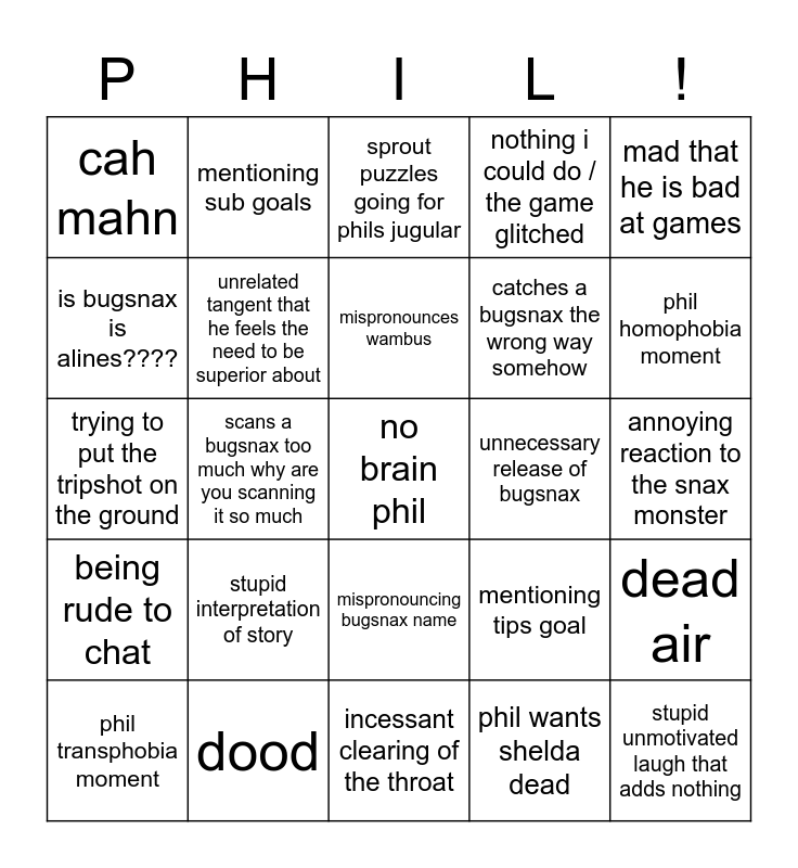 This bingo card has a free space and 24 words: stupid interpretation of story, dood, mispronounces wambus, phil transphobia moment, mad that he is bad at games, cah mahn, is bugsnax is alines????, mentioning sub goals, unnecessary release of bugsnax, mispronouncing bugsnax name, catches a bugsnax the wrong way somehow, trying to put the tripshot on the ground, mentioning tips goal, dead air, unrelated tangent that he feels the need to be superior about, phil wants shelda dead, annoying reaction to the snax monster, sprout puzzles going for phils jugular, phil homophobia moment, scans a bugsnax too much why are you scanning it so much, stupid unmotivated laugh that adds nothing, being rude to chat, nothing i could do / the game glitched and incessant clearing of the throat.