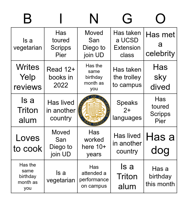 This bingo card has a free space and 84 words: Has a dog, Has surfed La Jolla Shores, Moved San Diego to join UD, Can do a cartwheel, Has worked here 10+ years, Is a Triton alum, Has 4+ siblings, Is a San Diego native, Has attended a performance on campus, Has toured the Stuart Art Collection, Has sky dived, Loves to cook, Read 12+ books in 2022, Speaks 2+ languages, Prefers tea over coffee, Is a vegetarian, Has the same birthday month as you, Writes Yelp reviews, Has toured Scripps Pier, Has played in a band, Has run the Triton 5K, Has taken the trolley to campus, Has a birthday this month, Can tell a work-appropriate joke, Has lived in another country, Has taken a UCSD Extension class, Has visited UCSD Park & Market downtown, Has met a celebrity, Went to a Padres game in 2022, Has surfed La Jolla Shores, Moved San Diego to join UD, Can do a cartwheel, Has worked here 10+ years, Is a Triton alum, Has 4+ siblings, Is a San Diego native, Has attended a performance on campus, Has toured the Stuart Art Collection, Has sky dived, Loves to cook, Read 12+ books in 2022, Speaks 2+ languages, Prefers tea over coffee, Is a vegetarian, Has the same birthday month as you, Writes Yelp reviews, Has toured Scripps Pier, Has played in a band, Has run the Triton 5K, Has taken the trolley to campus, Has a birthday this month, Has lived in another country, Has taken a UCSD Extension class, Has visited UCSD Park & Market downtown, Has met a celebrity, Prefers tea over coffee, Is a vegetarian, Has the same birthday month as you, Writes Yelp reviews, Has toured Scripps Pier, Has played in a band, Has run the Triton 5K, Has taken the trolley to campus, Has a birthday this month, Can tell a work-appropriate joke, Has lived in another country, Has taken a UCSD Extension class, Has visited UCSD Park & Market downtown, Has met a celebrity, Went to a Padre game in 2022, Has a dog, Has surfed La Jolla Shores, Moved San Diego to join UD, Can do a cartwheel, Has worked here 10+ years, Is a Triton alum, Has 4+ siblings, Is a San Diego native, Has attended a performance on campus, Has toured the Stuart Art Collection, Has sky dived, Loves to cook, Read 12+ books in 2022 and Speaks 2+ languages.