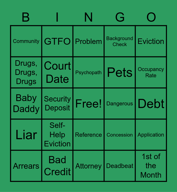 This bingo card has a free space and 69 words: Past Due Rent, Debt, Collection, Good Credit, Bad Credit, Resident, Background Check, Rental History, Eviction, Landlord, Application, Red Flag, Community, Problem, Income, Security Deposit, Reference, Pets, Bankruptcy, Liar, Dangerous, Concession, Occupancy Rate, Lease, Drop Box, Mail, Rent, Promise-to-Pay, Deadbeat, Crackhouse, GTFO, Legal Receipt, Levy, Damages, Skip, Fraud, Chapter 7, Chapter 13, Drugs, Drugs, Drugs, Expert, Self-Help Eviction, 1st of the Month, 5th of the Month, Abandonment, URLTA, Arrears, COVID-19, CARES Act, Judgment, Court Date, Psychopath, Facebook, Cash for Keys, Attorney, Bills, Bills, Bills, Brimley, 30-Day Notice to Pay, Nashville, Baby Momma, Baby Daddy, Marijuana, Dope, Arrest, Police, Bounced Check, Criminal, Kick Rocks, Super Bowl Ring and Horse.