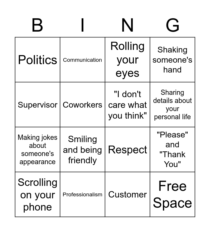 This bingo card has 16 words: Professionalism, "Please" and "Thank You", Rolling your eyes, Politics, Making jokes about someone's appearance, Communication, Respect, Customer, Supervisor, Coworkers, Scrolling on your phone, Shaking someone's hand, Smiling and being friendly, Sharing details about your personal life, "I don't care what you think" and Free Space.
