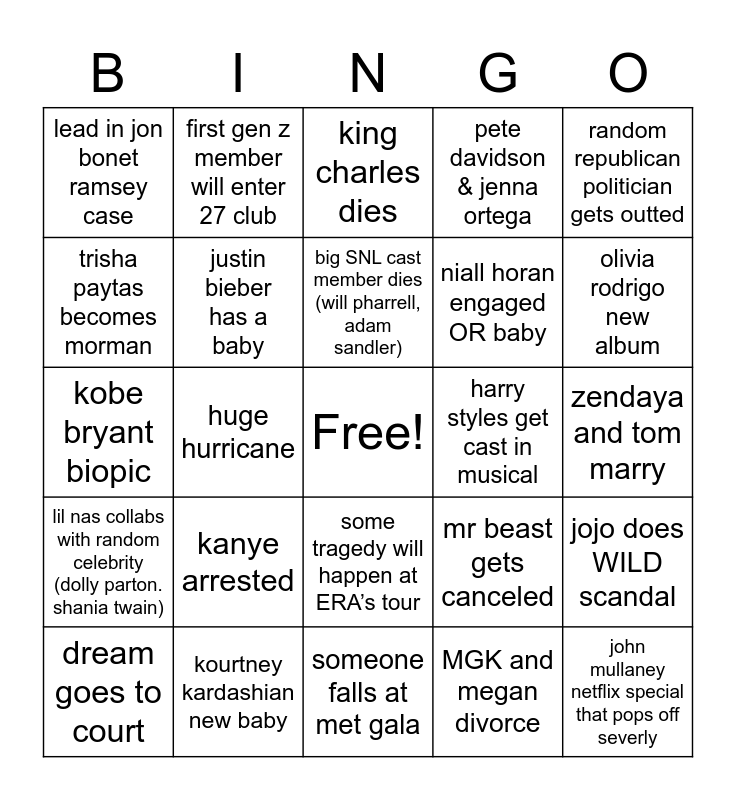 This bingo card has a free space and 24 words: kanye arrested, kourtney kardashian new baby, big SNL cast member dies (will pharrell, adam sandler), dream goes to court, random republican politician gets outted, lead in jon bonet ramsey case, trisha paytas becomes morman, first gen z member will enter 27 club, harry styles get cast in musical, some tragedy will happen at ERA’s tour, niall horan engaged OR baby, kobe bryant biopic, mr beast gets canceled, jojo does WILD scandal, justin bieber has a baby, MGK and megan divorce, zendaya and tom marry, king charles dies, olivia rodrigo new album, huge hurricane, john mullaney netflix special that pops off severly, lil nas collabs with random celebrity (dolly parton. shania twain), pete davidson & jenna ortega and someone falls at met gala.