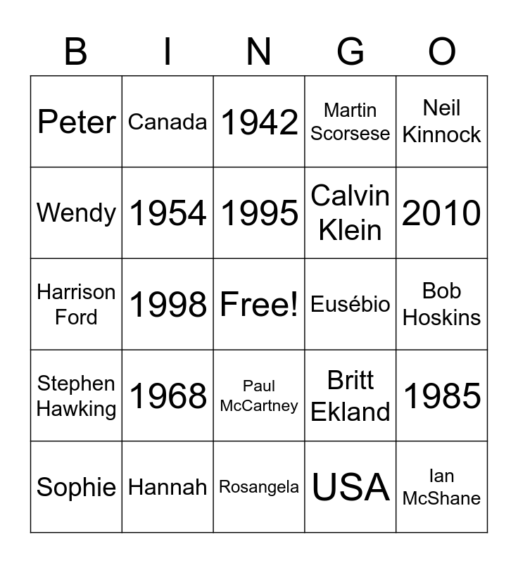 This bingo card has a free space and 54 words: Muhammad Ali, Stephen Hawking, Jimi Hendrix, Aretha Franklin, Paul McCartney, Barbra Streisand, Martin Scorsese, Billy Connolly, Wendy, Lee, Peter, Gill, Hannah, Sophie, Keith, Rosangela, Ian McShane, Calvin Klein, John Thaw, Bob Hoskins, Britt Ekland, Michael Crawford, Eusébio, Neil Kinnock, Brian Wilson, Canada, Brazil, France, Hawaii, USA, Germany, Holland, Jean, Sydney, 1942, Bambi, Harrison Ford, 1985, 1947, 1954, 1957, 1959, 1961, 1964, 1968, 1977, 1993, 2009, 1995, 1998, 2010, 2014, 2017 and 2022.