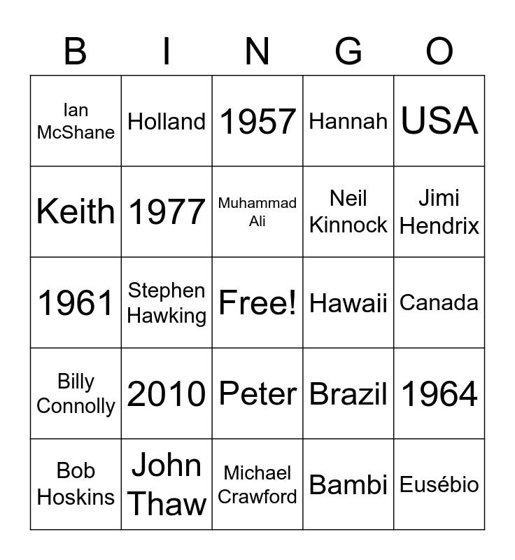 This bingo card has a free space and 54 words: Martin Scorsese, Billy Connolly, Wendy, Lee, Peter, Gill, Hannah, Sophie, Keith, Rosangela, Ian McShane, Calvin Klein, John Thaw, Bob Hoskins, Britt Ekland, Michael Crawford, Eusébio, Neil Kinnock, Brian Wilson, Canada, Brazil, France, Hawaii, USA, Germany, Holland, Jean, Sydney, 1942, Bambi, Harrison Ford, 1985, 1947, 1954, 1957, 1959, 1961, 1964, 1968, 1977, 1993, 2009, 1995, 1998, 2010, 2014, 2017, 2022, Muhammad Ali, Stephen Hawking, Jimi Hendrix, Aretha Franklin, Paul McCartney and Barbra Streisand.