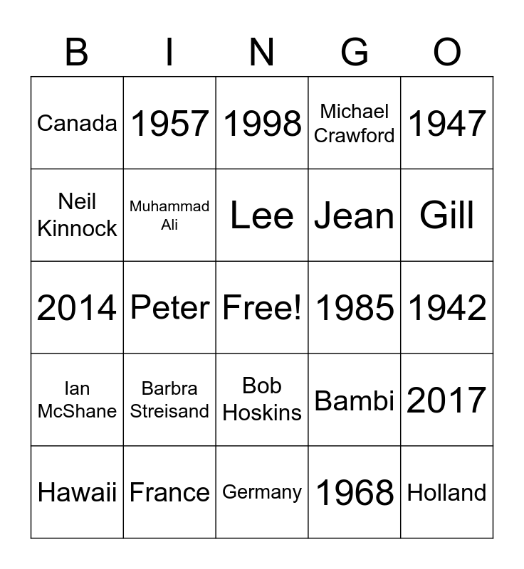 This bingo card has a free space and 54 words: Rosangela, Ian McShane, Calvin Klein, John Thaw, Bob Hoskins, Britt Ekland, Michael Crawford, Eusébio, Neil Kinnock, Brian Wilson, Canada, Brazil, France, Hawaii, USA, Germany, Holland, Jean, Sydney, 1942, Bambi, Harrison Ford, 1985, 1947, 1954, 1957, 1959, 1961, 1964, 1968, 1977, 1993, 2009, 1995, 1998, 2010, 2014, 2017, 2022, Muhammad Ali, Stephen Hawking, Jimi Hendrix, Aretha Franklin, Paul McCartney, Barbra Streisand, Martin Scorsese, Billy Connolly, Wendy, Lee, Peter, Gill, Hannah, Sophie and Keith.