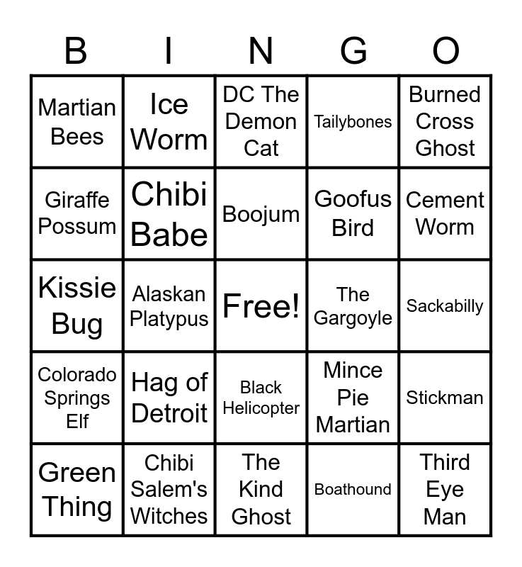 This bingo card has a free space and 24 words: Hag of Detroit, Chibi Salem's Witches, Boojum, Green Thing, Burned Cross Ghost, Martian Bees, Giraffe Possum, Ice Worm, The Gargoyle, Black Helicopter, Goofus Bird, Kissie Bug, Mince Pie Martian, Stickman, Chibi Babe, Boathound, Sackabilly, DC The Demon Cat, Cement Worm, Alaskan Platypus, Third Eye Man, Colorado Springs Elf, Tailybones and The Kind Ghost.