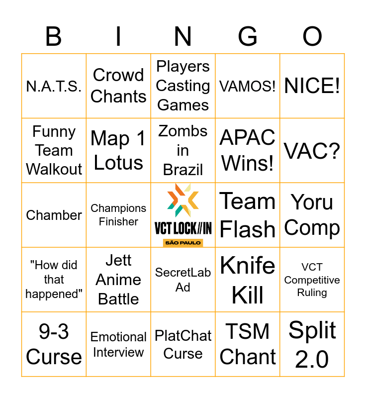 This bingo card has a free space and 39 words: Roza Ult, Anything G2, Benkai Walkout, Map 1 Lotus, 9-3 Curse, SecretLab Ad, Zombs in Brazil, Red Bull Clutch, NICE!, "How did that happened", Champions Finisher, VAMOS!, Split 2.0, Yoru Comp, Team Flash, Jett Anime Battle, Harbor Ace, N.A.T.S., Ninja Defuse, Knife Kill, Funny Team Walkout, PlatChat Curse, APAC Wins!, VAC?, Fnatic wins it all, #CHINASWEEP, LOUD Back2Back, 6th Man comes off the bench, #WGaming, Crowd Chants, Middle Finger, Boaster Shenanigans, Players Casting Games, Emotional Interview, TSM Chant, NICEU, VCT Competitive Ruling, Chamber and 13-0.