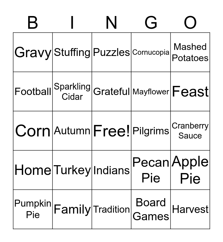 This bingo card has a free space and 24 words: Turkey, Family, Grateful, Pumpkin Pie, Mashed Potatoes, Gravy, Football, Stuffing, Pilgrims, Indians, Mayflower, Corn, Pecan Pie, Apple Pie, Sparkling Cidar, Board Games, Cranberry Sauce, Puzzles, Feast, Autumn, Harvest, Home, Cornucopia and Tradition.