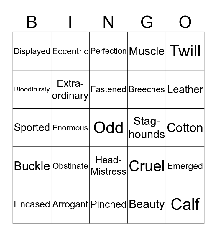 This bingo card has a free space and 24 words: Obstinate, Arrogant, Fastened, Encased, Twill, Displayed, Bloodthirsty, Eccentric, Stag-hounds, Head-Mistress, Breeches, Sported, Cruel, Emerged, Extra-ordinary, Beauty, Cotton, Perfection, Leather, Enormous, Calf, Buckle, Muscle and Pinched.