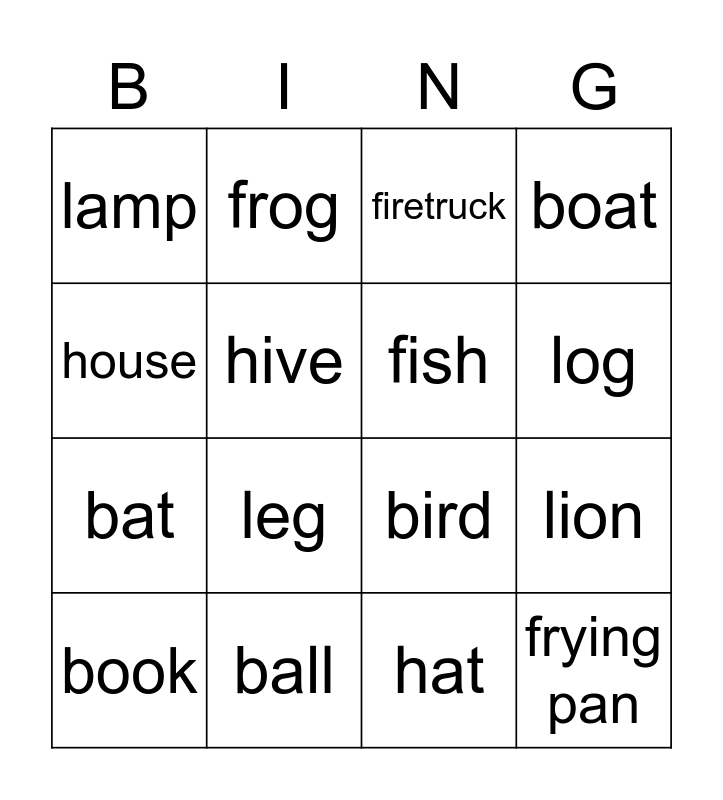 This bingo card has 16 words: ball, lion, firetruck, lamp, bat, frog, bird, hat, house, hive, book, boat, leg, log, fish and frying pan.