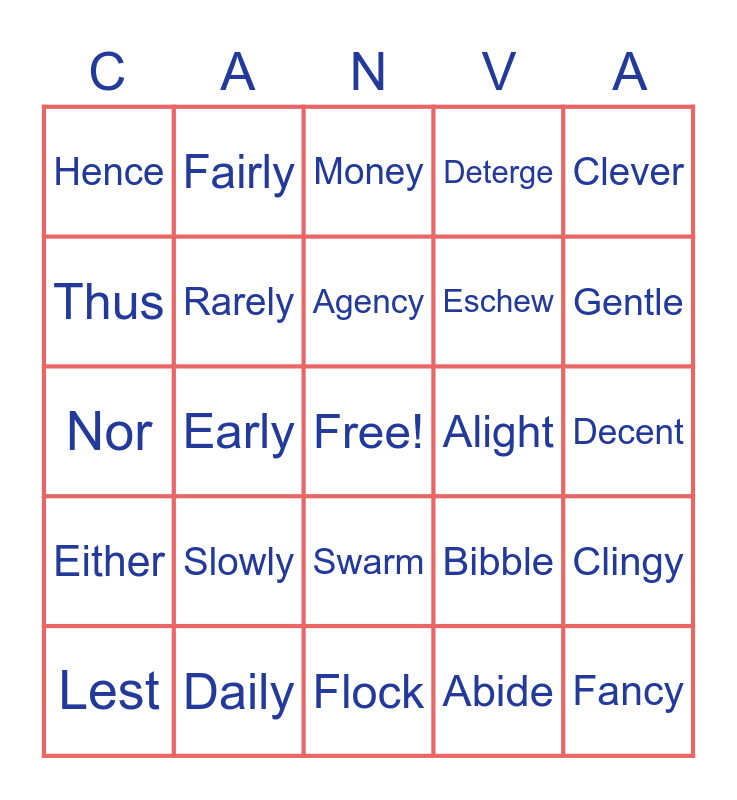 This bingo card has a free space and 24 words: Lest, Slowly, Agency, Abide, Clever, Hence, Fairly, Money, Alight, Decent, Nor, Rarely, Bibble, Clingy, Thus, Daily, Flock, Deterge, Gentle, Either, Early, Swarm, Eschew and Fancy.