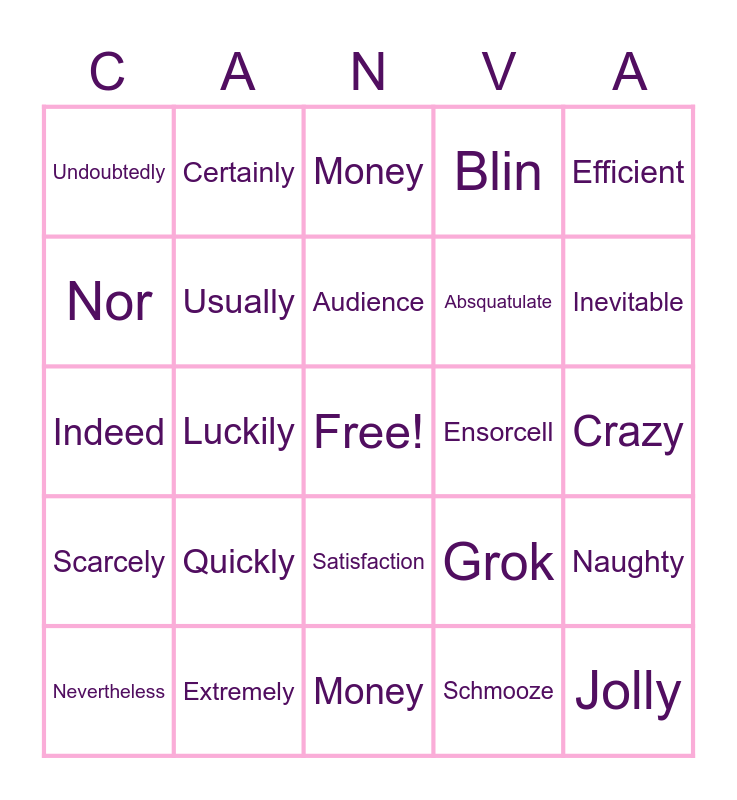 This bingo card has a free space and 24 words: Nevertheless, Quickly, Audience, Schmooze, Efficient, Undoubtedly, Certainly, Money, Ensorcell, Crazy, Indeed, Usually, Grok, Naughty, Nor, Extremely, Money, Blin, Inevitable, Scarcely, Luckily, Satisfaction, Absquatulate and Jolly.