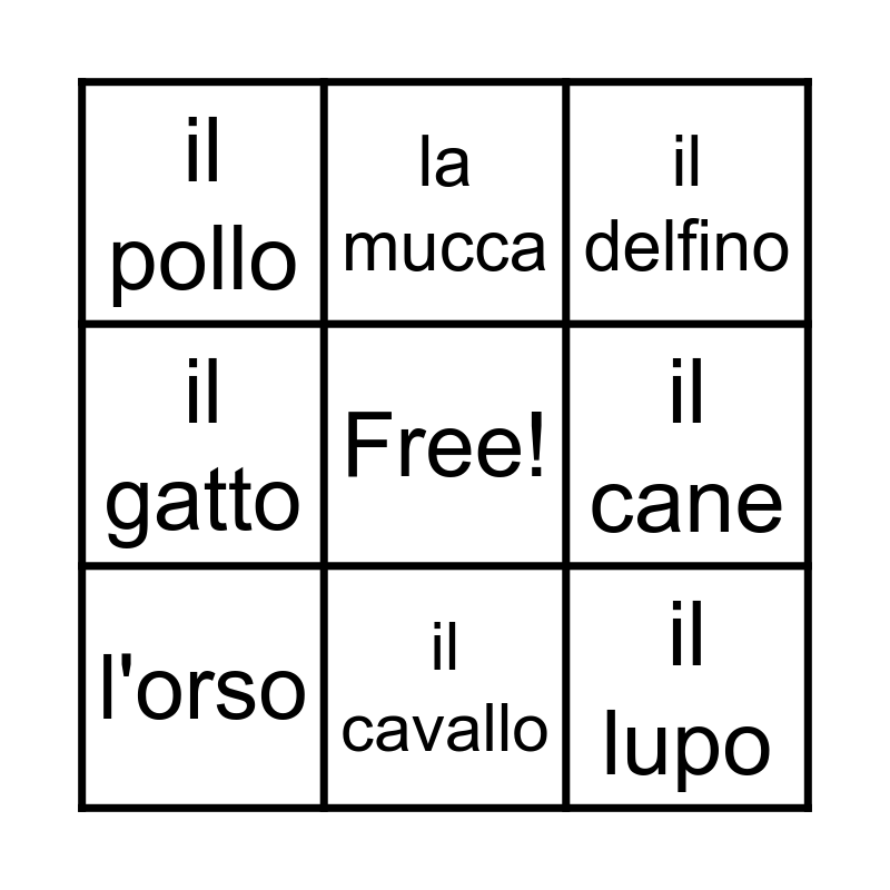 This bingo card has a free space and 8 words: il cane, il delfino, la mucca, l'orso, il pollo, il lupo, il gatto and il cavallo.