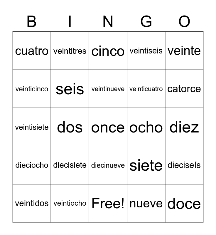 This bingo card has 31 words: Free!, uno, dos, tres, cuatro, cinco, seis, siete, ocho, nueve, diez, once, doce, trece, catorce, quince, dieciseís, diecisiete, dieciocho, diecinueve, veinte, veintiuno, veintidos, veintitres, veinticuatro, veinticinco, veintiseis, veintisiete, veintiocho, veintinueve and treinta.
