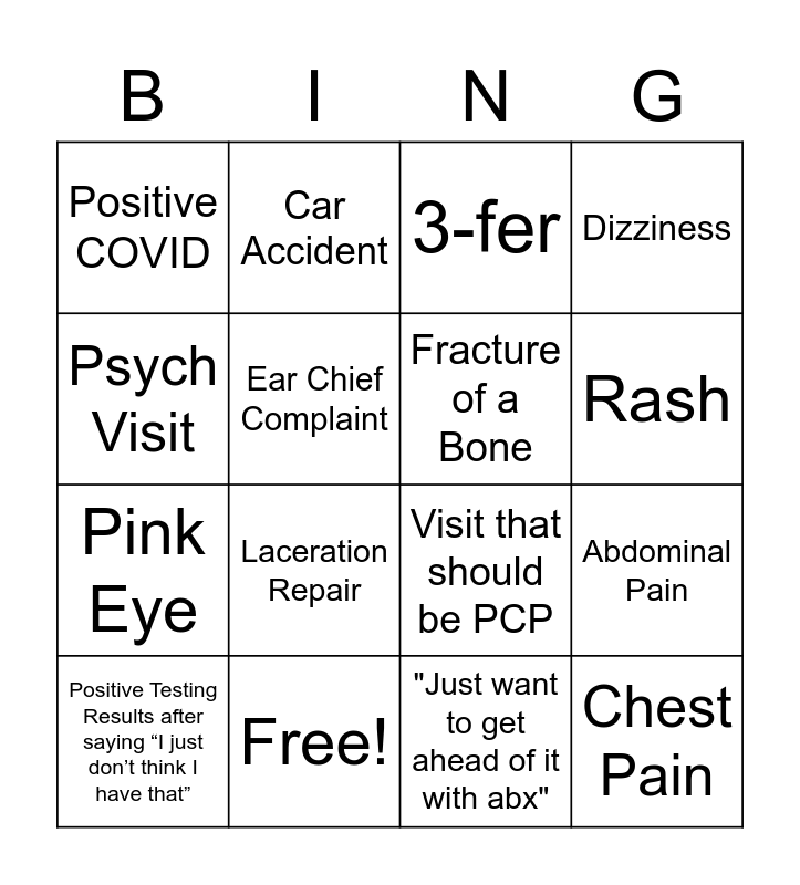 This bingo card has 21 words: Free!, Slipped on ice, Car Accident, UTI, "Just want to get ahead of it with abx", Fracture of a Bone, Positive COVID, 3-fer, Visit that should be PCP, Rash, Pink Eye, Dizziness, Chest Pain, Nausea and Vomiting, Ear Chief Complaint, Kid with Fever and no Meds, Positive Testing Results after saying “I just don’t think I have that”, Laceration Repair, Psych Visit, Abdominal Pain and Flu A+.