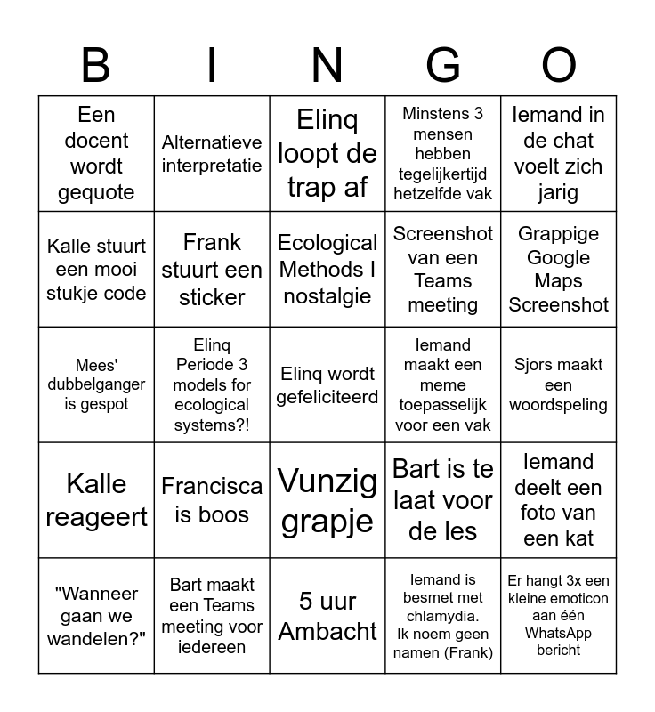 This bingo card has a free space and 24 words: Francisca is boos, Bart maakt een Teams meeting voor iedereen, Ecological Methods I nostalgie, "Wanneer gaan we wandelen?", Iemand in de chat voelt zich jarig, Een docent wordt gequote, Kalle stuurt een mooi stukje code, Alternatieve interpretatie, Iemand maakt een meme toepasselijk voor een vak, Vunzig grapje, Screenshot van een Teams meeting, Mees' dubbelganger is gespot, Bart is te laat voor de les, Iemand deelt een foto van een kat, Frank stuurt een sticker, Iemand is besmet met chlamydia. Ik noem geen namen (Frank), Sjors maakt een woordspeling, Elinq loopt de trap af, Grappige Google Maps Screenshot, Elinq Periode 3 models for ecological systems?!, Er hangt 3x een kleine emoticon aan één WhatsApp bericht, Kalle reageert, Minstens 3 mensen hebben tegelijkertijd hetzelfde vak and 5 uur Ambacht.