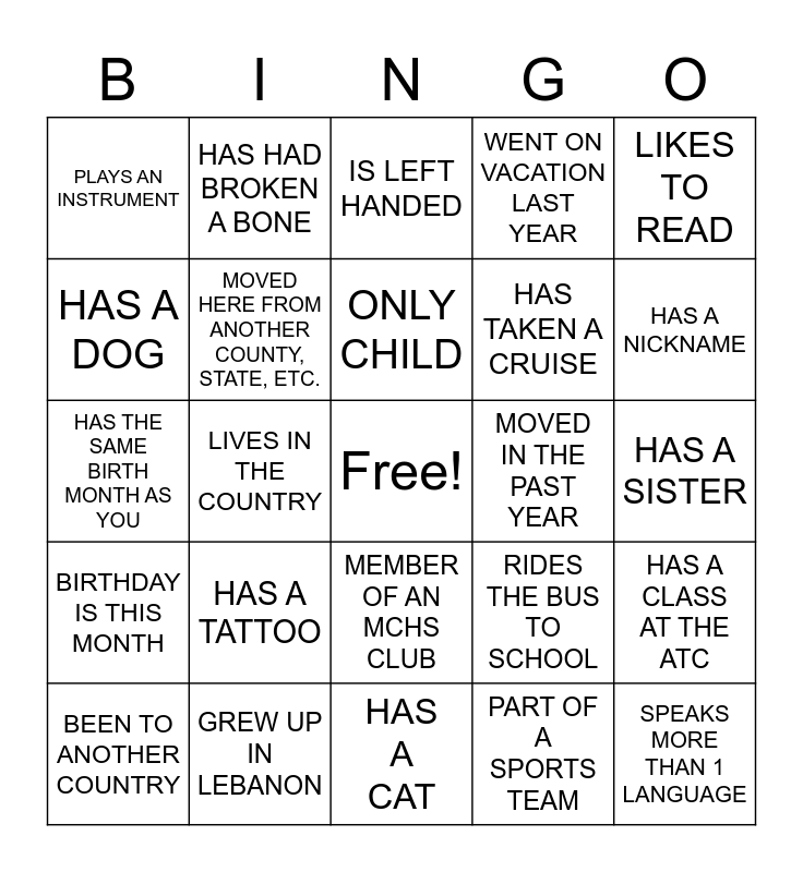 This bingo card has a free space and 24 words: HAS A TATTOO, GREW UP IN LEBANON, ONLY CHILD, BEEN TO ANOTHER COUNTRY, LIKES TO READ, PLAYS AN INSTRUMENT, HAS A DOG, HAS HAD BROKEN A BONE, MOVED IN THE PAST YEAR, MEMBER OF AN MCHS CLUB, HAS TAKEN A CRUISE, HAS THE SAME BIRTH MONTH AS YOU, RIDES THE BUS TO SCHOOL, HAS A CLASS AT THE ATC, MOVED HERE FROM ANOTHER COUNTY, STATE, ETC., PART OF A SPORTS TEAM, HAS A SISTER, IS LEFT HANDED, HAS A NICKNAME, LIVES IN THE COUNTRY, SPEAKS MORE THAN 1 LANGUAGE, BIRTHDAY IS THIS MONTH, WENT ON VACATION LAST YEAR and HAS A CAT.
