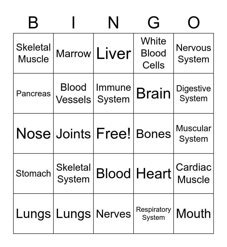 This bingo card has a free space and 24 words: Skeletal System, Lungs, Immune System, Lungs, Nervous System, Skeletal Muscle, Pancreas, Marrow, Bones, Blood, Brain, Nose, Heart, Cardiac Muscle, Blood Vessels, Respiratory System, Muscular System, Liver, Digestive System, Joints, Mouth, Stomach, White Blood Cells and Nerves.