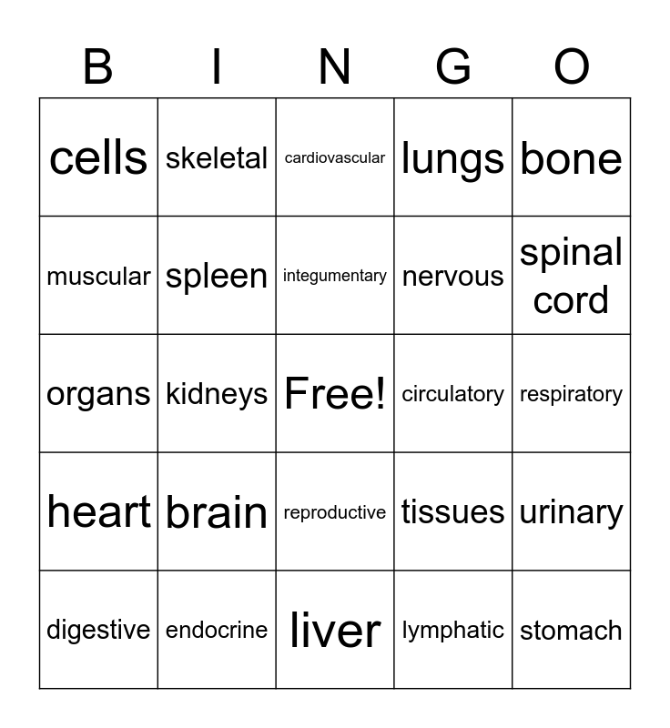 This bingo card has a free space and 24 words: brain, endocrine, integumentary, digestive, bone, cells, muscular, skeletal, circulatory, reproductive, nervous, organs, tissues, urinary, spleen, lymphatic, respiratory, cardiovascular, spinal cord, kidneys, stomach, heart, lungs and liver.