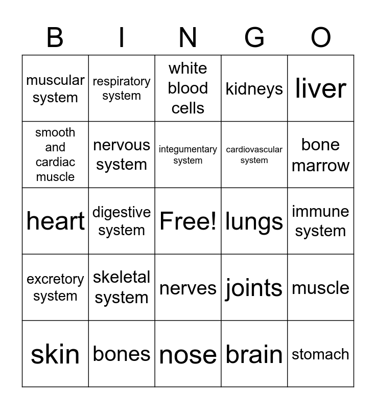 This bingo card has a free space and 24 words: skeletal system, bones, integumentary system, skin, liver, muscular system, smooth and cardiac muscle, respiratory system, lungs, nerves, cardiovascular system, heart, joints, muscle, nervous system, brain, immune system, white blood cells, bone marrow, digestive system, stomach, excretory system, kidneys and nose.