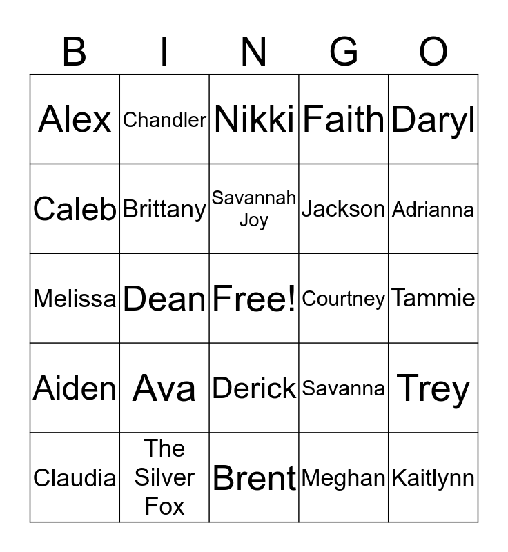 This bingo card has a free space and 30 words: The Silver Fox, The Beloved One, Dean, Amy, Alex, Nikki, Brittany, Derick, Courtney, Brent, Tammie, Kaitlynn, Meghan, Mollie, Adrianna, Mikayla, Savanna, Aiden, Ava, Daryl, Melissa, Jordan, Chandler, Jackson, Caleb, Faith, Trey, Claudia, Savannah Joy and Jackson's Megan.