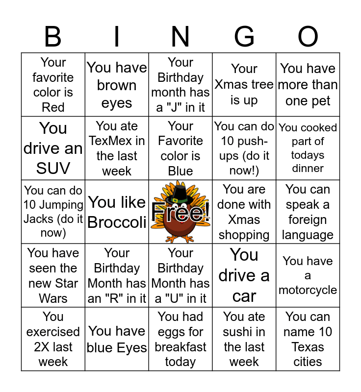 This bingo card has a free space and 24 words: Your Birthday Month has an "R" in it, You have blue Eyes, Your Favorite color is Blue, You exercised 2X last week, You have more than one pet, Your favorite color is Red, You drive an SUV, You have brown eyes, You are done with Xmas shopping, Your Birthday Month has a "U" in it, You can do 10 push-ups (do it now!), You can do 10 Jumping Jacks (do it now), You drive a car, You have a motorcycle, You ate TexMex in the last week, You ate sushi in the last week, You can speak a foreign language, Your Birthday month has a "J" in it, You cooked part of todays dinner, You like Broccoli, You can name 10 Texas cities, You have seen the new Star Wars, Your Xmas tree is up and You had eggs for breakfast today.