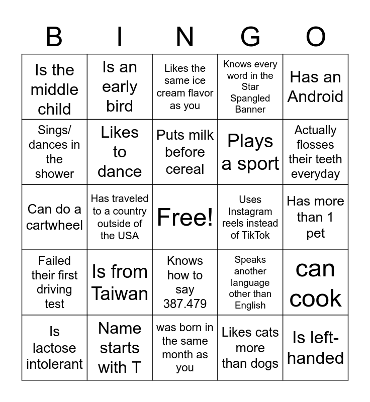 This bingo card has a free space and 24 words: Is from Taiwan, Name starts with T, Puts milk before cereal, Is lactose intolerant, Has an Android, Is the middle child, Sings/ dances in the shower, Is an early bird, Uses Instagram reels instead of TikTok, Knows how to say 387.479, Plays a sport, Can do a cartwheel, Speaks another language other than English, can cook, Likes to dance, Likes cats more than dogs, Has more than 1 pet, Likes the same ice cream flavor as you, Actually flosses their teeth everyday, Has traveled to a country outside of the USA, Is left-handed, Failed their first driving test, Knows every word in the Star Spangled Banner and was born in the same month as you.