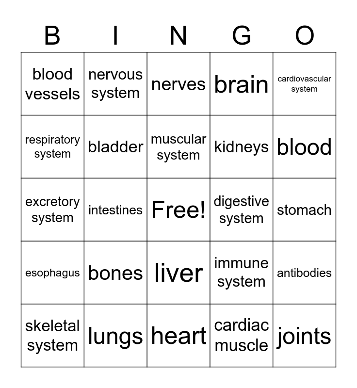 This bingo card has a free space and 24 words: skeletal system, bones, muscular system, cardiac muscle, cardiovascular system, blood vessels, nervous system, nerves, digestive system, stomach, excretory system, bladder, immune system, antibodies, respiratory system, lungs, heart, brain, blood, esophagus, intestines, liver, kidneys and joints.
