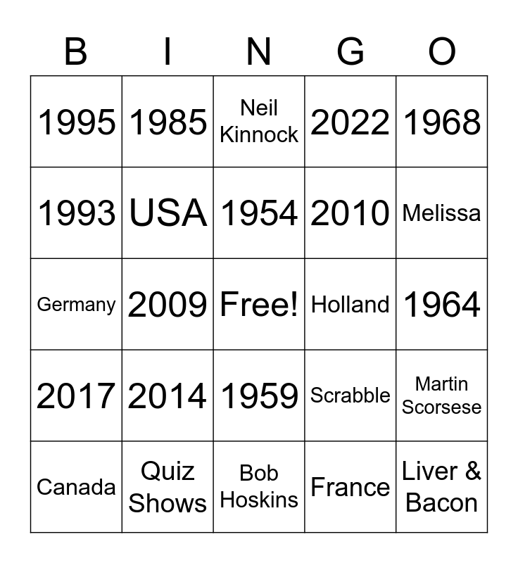 This bingo card has a free space and 63 words: Aretha Franklin, Paul McCartney, Barbra Streisand, Martin Scorsese, Billy Connolly, 1942, 1985, 1947, 1954, 1957, 1959, 1961, 1964, 1968, 1977, 1993, 2009, 1995, 1998, 2010, 2014, 2017, 2022, Wendy, Lee, Peter, Gill, Hannah, Sophie, Keith, Rosangela, Jean, Sydney, Nicholas, Melissa, Canada, Brazil, France, Hawaii, USA, Germany, Holland, Caravaning, Fish & Chips, Liver & Bacon, Quiz Shows, Family History, Scrabble, Roast Dinner, Bambi, Harrison Ford, Bob Hoskins, Britt Ekland, Michael Crawford, Eusébio, Neil Kinnock, Brian Wilson, Ian McShane, Calvin Klein, John Thaw, Muhammad Ali, Stephen Hawking and Jimi Hendrix.