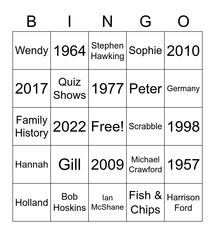 This bingo card has a free space and 63 words: 1985, 1947, 1954, 1957, 1959, 1961, 1964, 1968, 1977, 1993, 2009, 1995, 1998, 2010, 2014, 2017, 2022, Wendy, Lee, Peter, Gill, Hannah, Sophie, Keith, Rosangela, Jean, Sydney, Nicholas, Melissa, Canada, Brazil, France, Hawaii, USA, Germany, Holland, Caravaning, Fish & Chips, Liver & Bacon, Quiz Shows, Family History, Scrabble, Roast Dinner, Bambi, Harrison Ford, Bob Hoskins, Britt Ekland, Michael Crawford, Eusébio, Neil Kinnock, Brian Wilson, Ian McShane, Calvin Klein, John Thaw, Muhammad Ali, Stephen Hawking, Jimi Hendrix, Aretha Franklin, Paul McCartney, Barbra Streisand, Martin Scorsese, Billy Connolly and 1942.