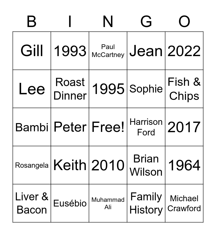 This bingo card has a free space and 63 words: 1957, 1959, 1961, 1964, 1968, 1977, 1993, 2009, 1995, 1998, 2010, 2014, 2017, 2022, Wendy, Lee, Peter, Gill, Hannah, Sophie, Keith, Rosangela, Jean, Sydney, Nicholas, Melissa, Canada, Brazil, France, Hawaii, USA, Germany, Holland, Caravaning, Fish & Chips, Liver & Bacon, Quiz Shows, Family History, Scrabble, Roast Dinner, Bambi, Harrison Ford, Bob Hoskins, Britt Ekland, Michael Crawford, Eusébio, Neil Kinnock, Brian Wilson, Ian McShane, Calvin Klein, John Thaw, Muhammad Ali, Stephen Hawking, Jimi Hendrix, Aretha Franklin, Paul McCartney, Barbra Streisand, Martin Scorsese, Billy Connolly, 1942, 1985, 1947 and 1954.