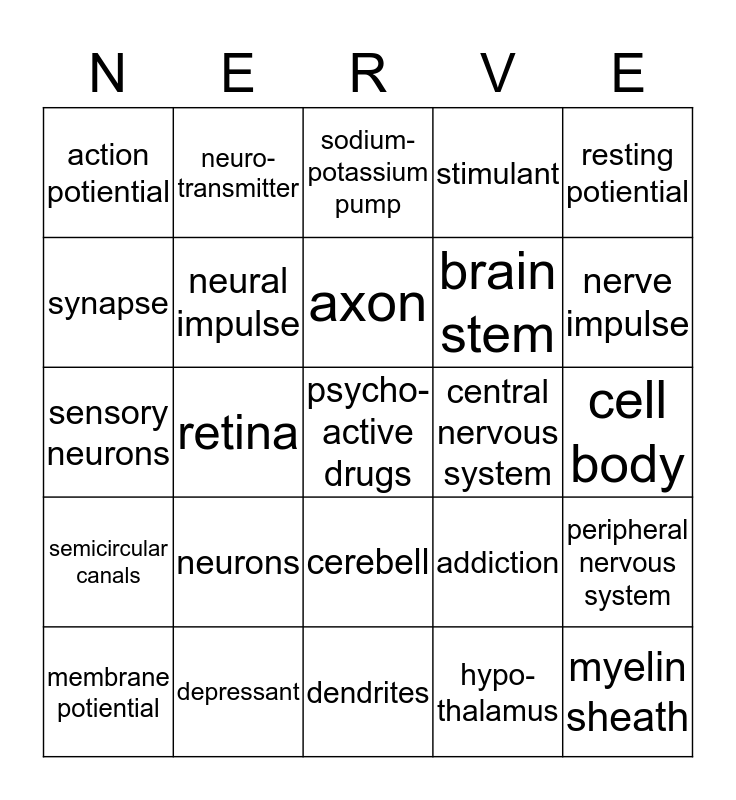 This bingo card has 25 words: neurons, dendrites, axon, membrane potiential, resting potiential, action potiential, synapse, neuro- transmitter, central nervous system, cerebell, brain stem, sensory neurons, addiction, peripheral nervous system, neural impulse, myelin sheath, cell body, sodium-potassium pump, nerve impulse, retina, psycho-active drugs, depressant, semicircular canals, stimulant and hypo-thalamus.