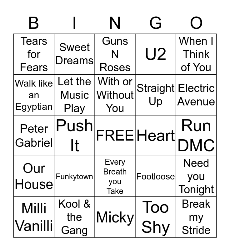 This bingo card has a free space and 24 words: Funkytown, Kool & the Gang, With or Without You, Milli Vanilli, When I Think of You, Tears for Fears, Walk like an Egyptian, Sweet Dreams, Heart, Every Breath you Take, Straight Up, Peter Gabriel, Footloose, Need you Tonight, Let the Music Play, Too Shy, Run DMC, Guns N Roses, Electric Avenue, Push It, Break my Stride, Our House, U2 and Micky.