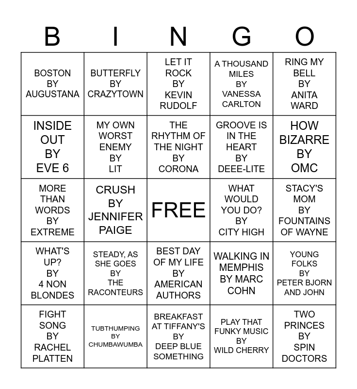 This bingo card has a free space and 34 words: MICKEY BY TONI BASIL, WHO LET THE DOGS OUT BY THE BAHA MEN, TAKE ON ME BY A-HA, TEENAGE DIRTBAG BY WHEATUS, STACY'S MOM BY FOUNTAINS OF WAYNE, INSIDE OUT BY EVE 6, MY OWN WORST ENEMY BY LIT, BREAKFAST AT TIFFANY'S BY DEEP BLUE SOMETHING, GROOVE IS IN THE HEART BY DEEE-LITE, TWO PRINCES BY SPIN DOCTORS, MORE THAN WORDS BY EXTREME, BUTTERFLY BY CRAZYTOWN, PLAY THAT FUNKY MUSIC BY WILD CHERRY, YOU GET WHAT YOU GIVE BY NEW RADICALS, WHAT'S UP? BY 4 NON BLONDES, CRUSH BY JENNIFER PAIGE, BEST DAY OF MY LIFE BY AMERICAN AUTHORS, WHAT WOULD YOU DO? BY CITY HIGH, YOUNG FOLKS BY PETER BJORN AND JOHN, FIGHT SONG BY RACHEL PLATTEN, TUBTHUMPING BY CHUMBAWUMBA, SPIRIT IN THE SKY BY NORMAN GREENBAUM, A THOUSAND MILES BY VANESSA CARLTON, HOW BIZARRE BY OMC, VIDEO KILLED THE RADIO STAR BY THE BUGGLES, STEADY, AS SHE GOES BY THE RACONTEURS, LET IT ROCK BY KEVIN RUDOLF, LAST NIGHT A DJ SAVED MY LIFE BY INDEEP, RING MY BELL BY ANITA WARD, BOSTON BY AUGUSTANA, LIPS OF AN ANGEL BY HINDER, THE RHYTHM OF THE NIGHT BY CORONA, WALKING IN MEMPHIS BY MARC COHN and SHAKE IT BY METRO STATION.