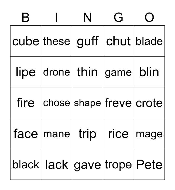 This bingo card has a free space and 44 words: lake, Pete, gripe, black, splove, trope, guff, climp, blade, lack, chut, freve, trip, mane, grube, gave, jom, fire, hunt, blin, these, drove, flume, cube, jute, crote, cage, spice, rice, face, race, mage, grape, shug, chose, sluve, tube, brush, thin, lipe, game, fresh, drone and Steve.