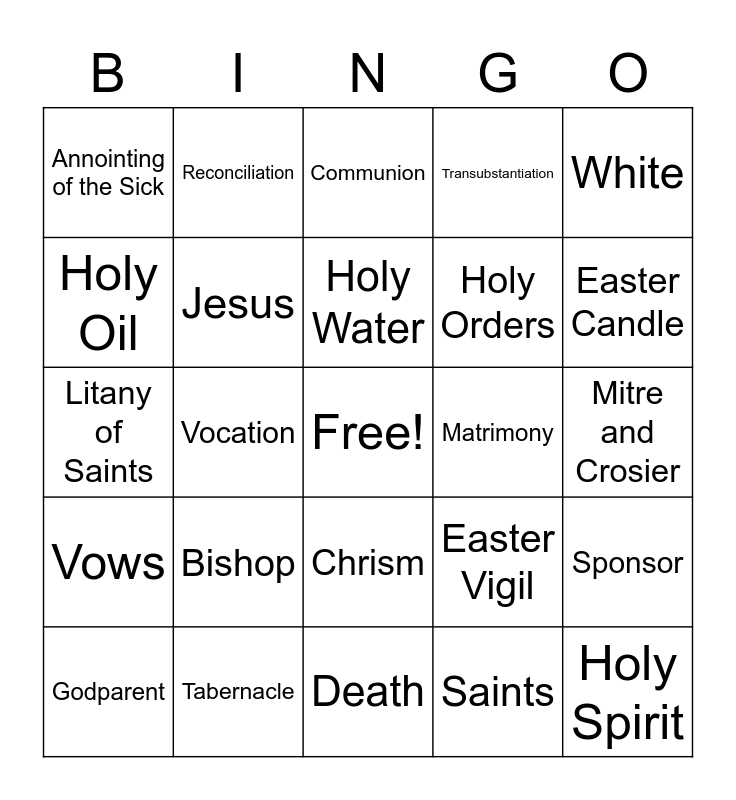 This bingo card has a free space and 40 words: Mass, Litany of Saints, John the Baptist, Jesus, Tabernacle, Chrism, Holy Water, Rings, White, Vows, Vocation, Transubstantiation, Holy Spirit, Mitre and Crosier, Matrimony, Bishop, Baptism, Annointing of the Sick, Confirmation, Communion, Sponsor, Saints, Holy Orders, Holy Oil, Incense, Bread and Wine, Nun, Deacon, Cross, Healing, Gospel, Godparent, Eucharist, Easter Vigil, Easter Candle, Death, Penance, Oil of the Sick, Reconciliation and Oil of Catechumens.