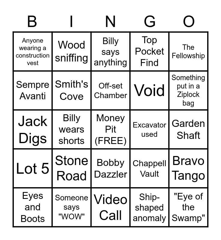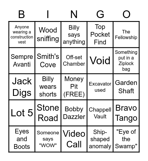 This bingo card has a free space and 24 words: Eyes and Boots, Stone Road, Off-set Chamber, Ship-shaped anomaly, The Fellowship, Anyone wearing a construction vest, Wood sniffing, Billy says anything, Excavator used, Garden Shaft, Jack Digs, Smith's Cove, Chappell Vault, Bravo Tango, Sempre Avanti, Someone says "WOW", Video Call, Top Pocket Find, Something put in a Ziplock bag, Lot 5, Billy wears shorts, Bobby Dazzler, Void and "Eye of the Swamp".
