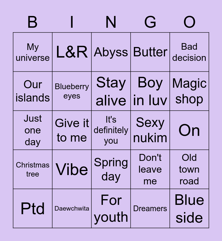 This bingo card has 25 words: Vibe, For youth, Stay alive, Ptd, Bad decision, My universe, Our islands, L&R, Sexy nukim, Spring day, Boy in luv, Just one day, Don't leave me, Old town road, Blueberry eyes, Blue side, On, Abyss, Magic shop, Give it to me, It's definitely you, Daewchwita, Christmas tree, Butter and Dreamers.