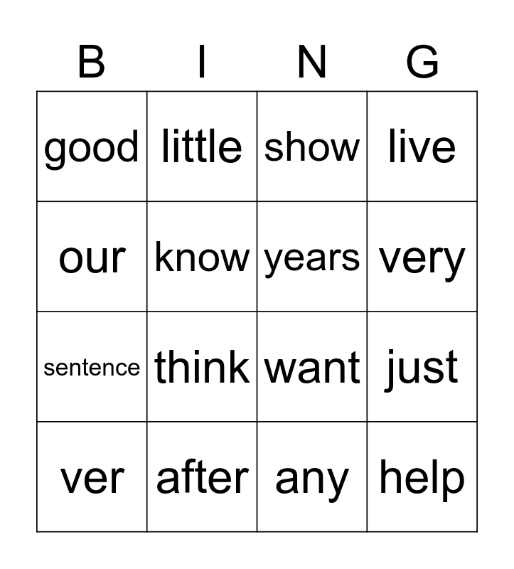 This bingo card has 49 words: Free!, ver, new, sound, take, only, little, work, know, place, years, live, me, back, give, most, very, after, things, our, just, name, good, sentence, man, think, say, great, where, help, through, much, before, line, right, too, means, old, any, same, tell, boy, follow, came, want, show, also, around and form.