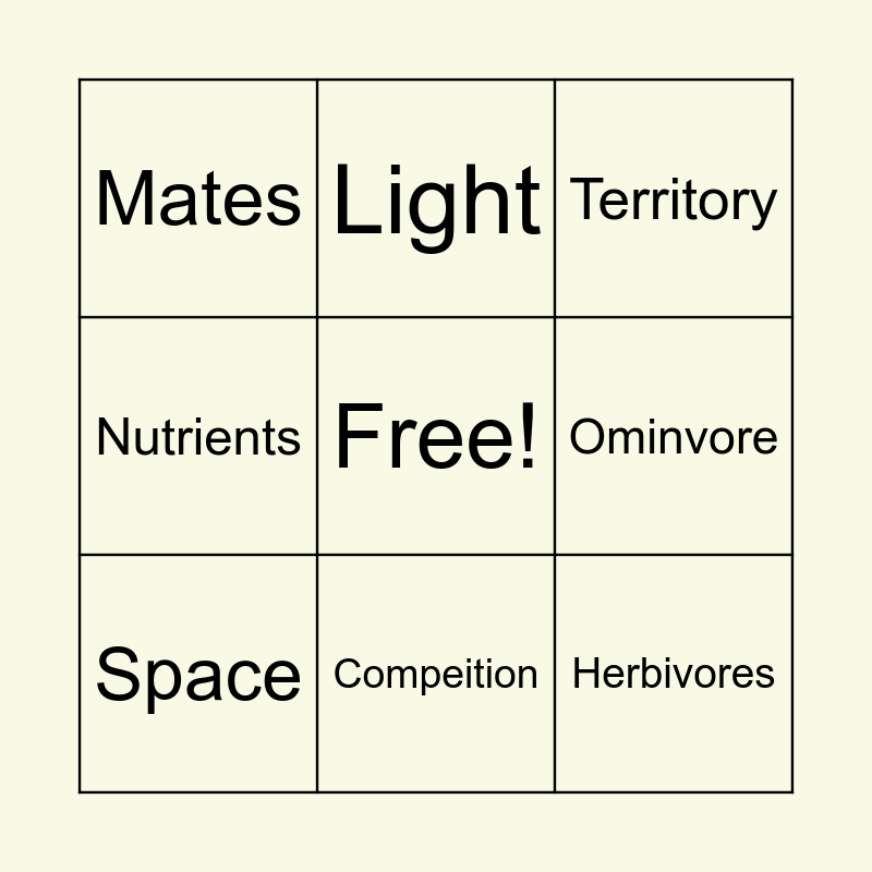This bingo card has a free space and 10 words: Compeition, Territory, Mates, Herbivores, Nutrients, Space, Light, Water, Ominvore and Carnivore.