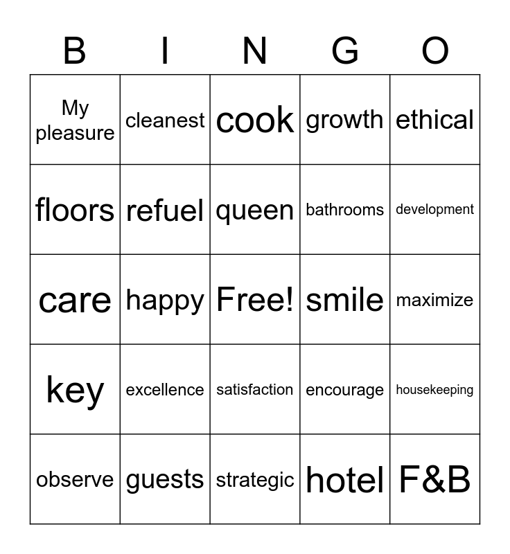This bingo card has a free space and 44 words: Aloft, F&B, meetings, observe, amenities, hotel, cook, values, ethical, guests, growth, smile, satisfaction, excellence, embrace, strategic, genuine, care, relentlessly, development, cleanest, associates, white lodging, My pleasure, complaints, maximize, GM, sales, encourage, key, paper, housekeeping, lunch, stay, happy, good job, checklist, king, queen, floors, bathrooms, policy, refuel and bar.