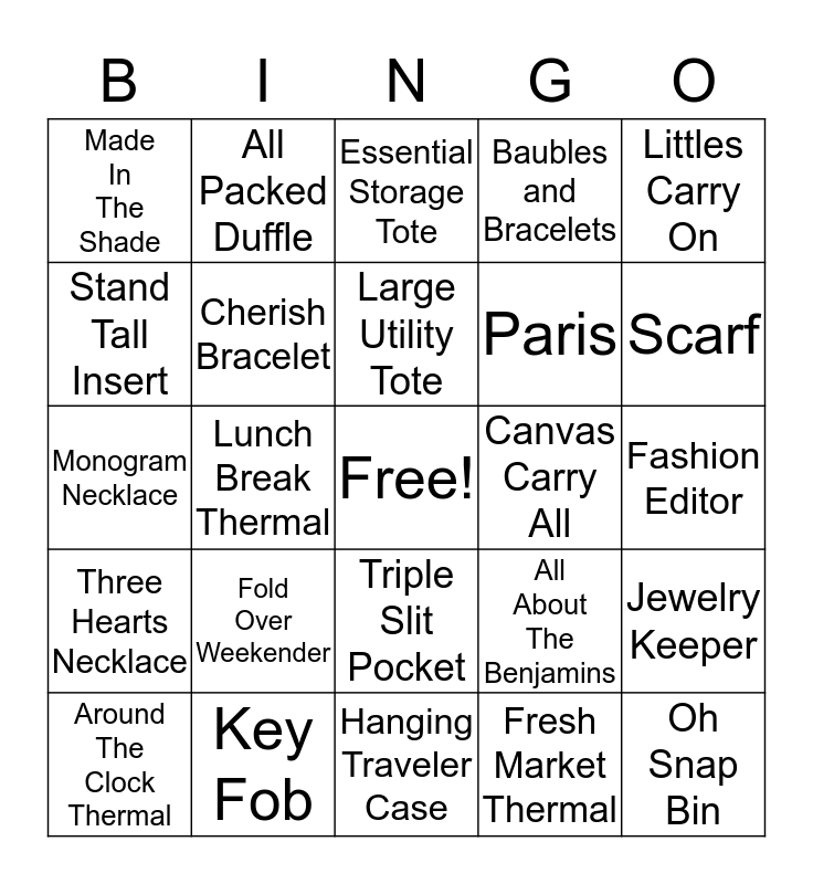 This bingo card has a free space and 24 words: Fold Over Weekender, Key Fob, Large Utility Tote, Around The Clock Thermal, Littles Carry On, Made In The Shade, Stand Tall Insert, All Packed Duffle, Canvas Carry All, Triple Slit Pocket, Paris, Monogram Necklace, All About The Benjamins, Jewelry Keeper, Cherish Bracelet, Fresh Market Thermal, Fashion Editor, Essential Storage Tote, Scarf, Lunch Break Thermal, Oh Snap Bin, Three Hearts Necklace, Baubles and Bracelets and Hanging Traveler Case.