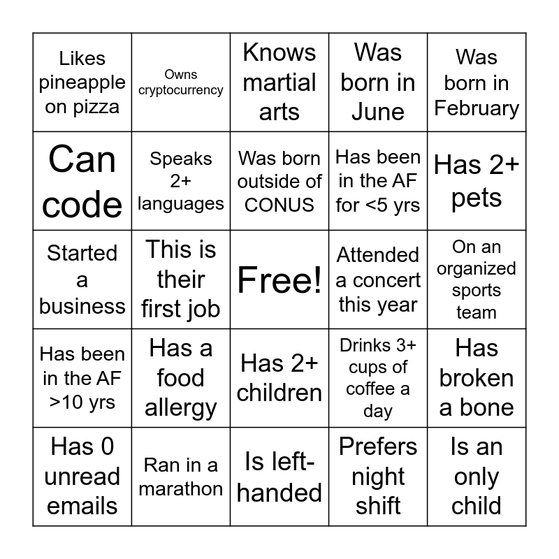 This bingo card has a free space and 29 words: Has 0 unread emails, Has a side hustle, This is their first job, Went viral online, Likes pineapple on pizza, Knows martial arts, Speaks 2+ languages, Has a food allergy, Attended a concert this year, Ran in a marathon, On an organized sports team, Is an only child, Is left-handed, Prefers night shift, Has 2+ pets, Plays a musical instrument, Has 2+ children, Has been in the AF >10 yrs, Was born in February, Started a business, Drinks 3+ cups of coffee a day, Attended a PDC in the past 6 months, Has been in the AF for <5 yrs, Can code, Was born in June, Owns cryptocurrency, Has broken a bone, Was born outside of CONUS and Doesn't have a middle name.